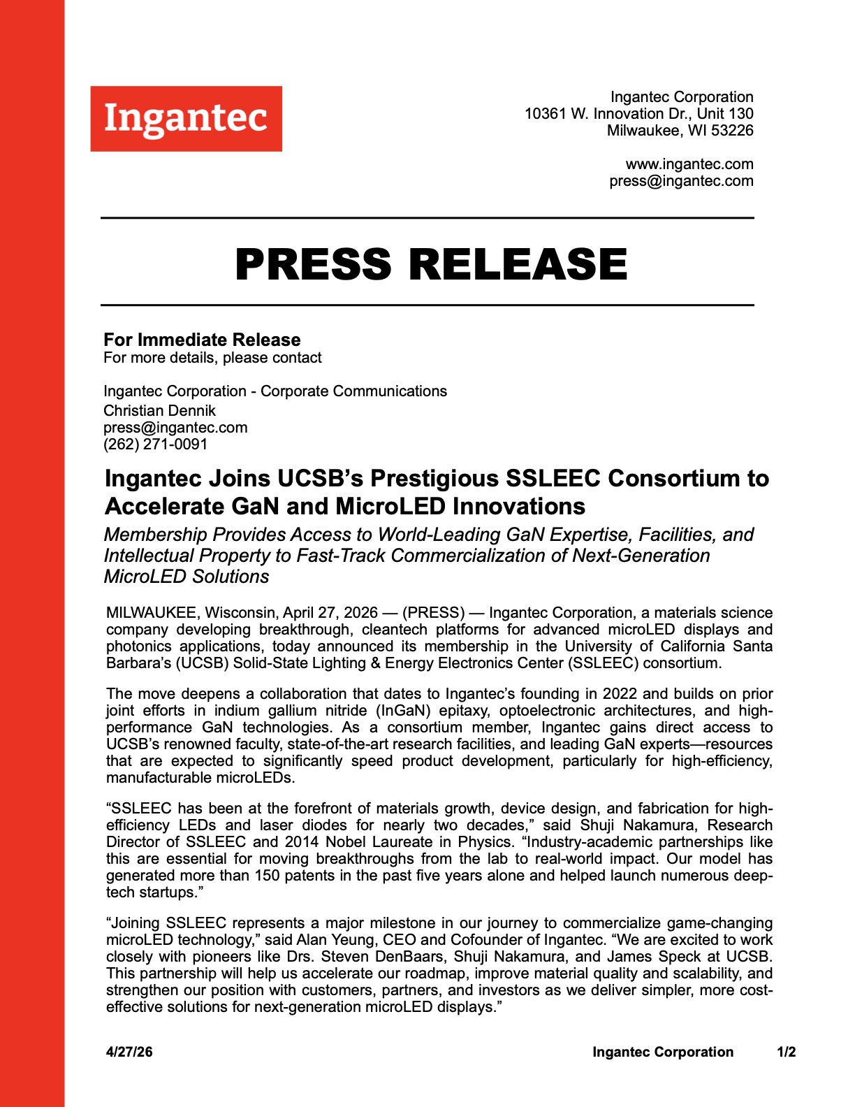 MILWAUKEE, WI, UNITED STATES, April 27, 2026 /EINPresswire.com/ — Ingantec Corporation, a materials science company developing breakthrough, cleantech platforms for advanced microLED displays and photonics applications, today announced its membership in the University of California Santa Barbara’s (UCSB) Solid-State Lighting & Energy Electronics Center (SSLEEC) consortium.